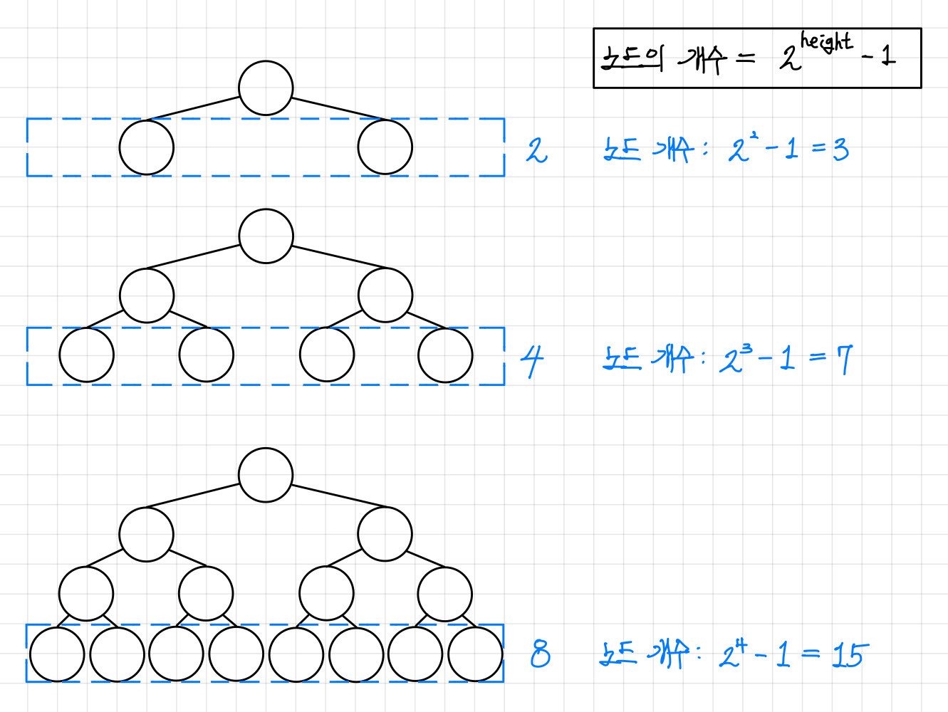 그렇기에 포화 이진 트리는 아래와 같은 형태를 갖게 되고, 모든 레벨이 2의 제곱수의 노드를 갖게 되므로 노드의 개수는 $$ 2^{height}-1 $$ 이 된다.▼