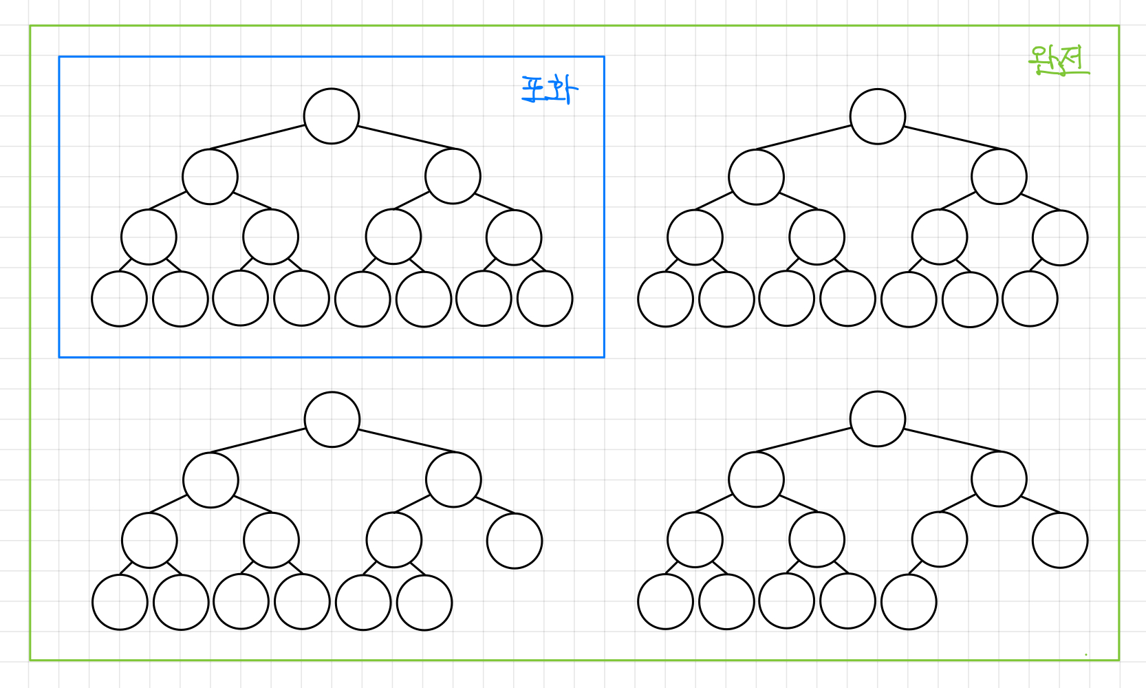 하나는 포화 이진 트리(Full Binary Tree), 다른 하나는 완전 이진 트리(Complete Binary Tree)이다.