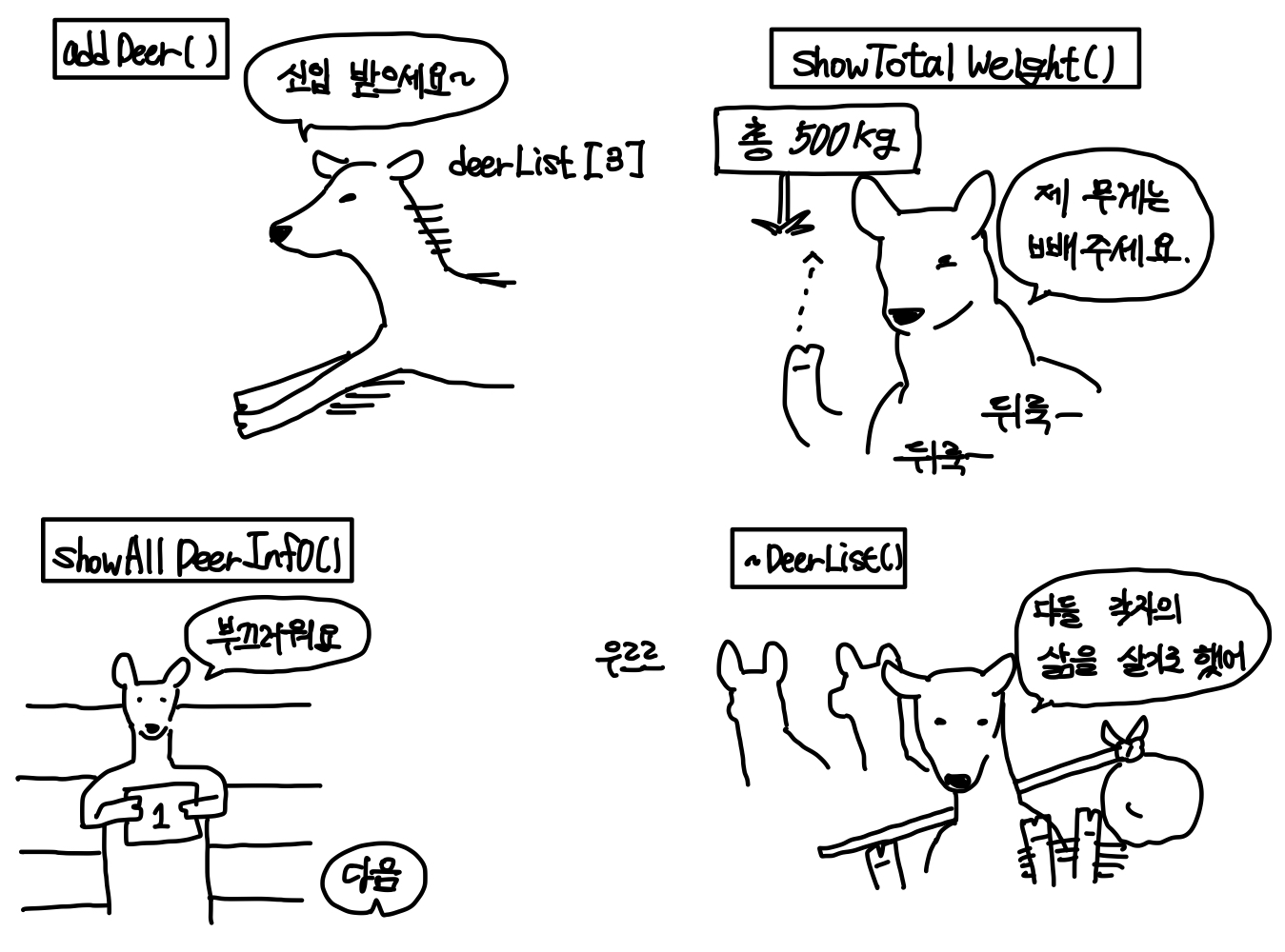 사슴들은 사슴 포인터 배열로 관리되며, DeerList는 배열을 관리하는 메소드를 갖는다. ▼