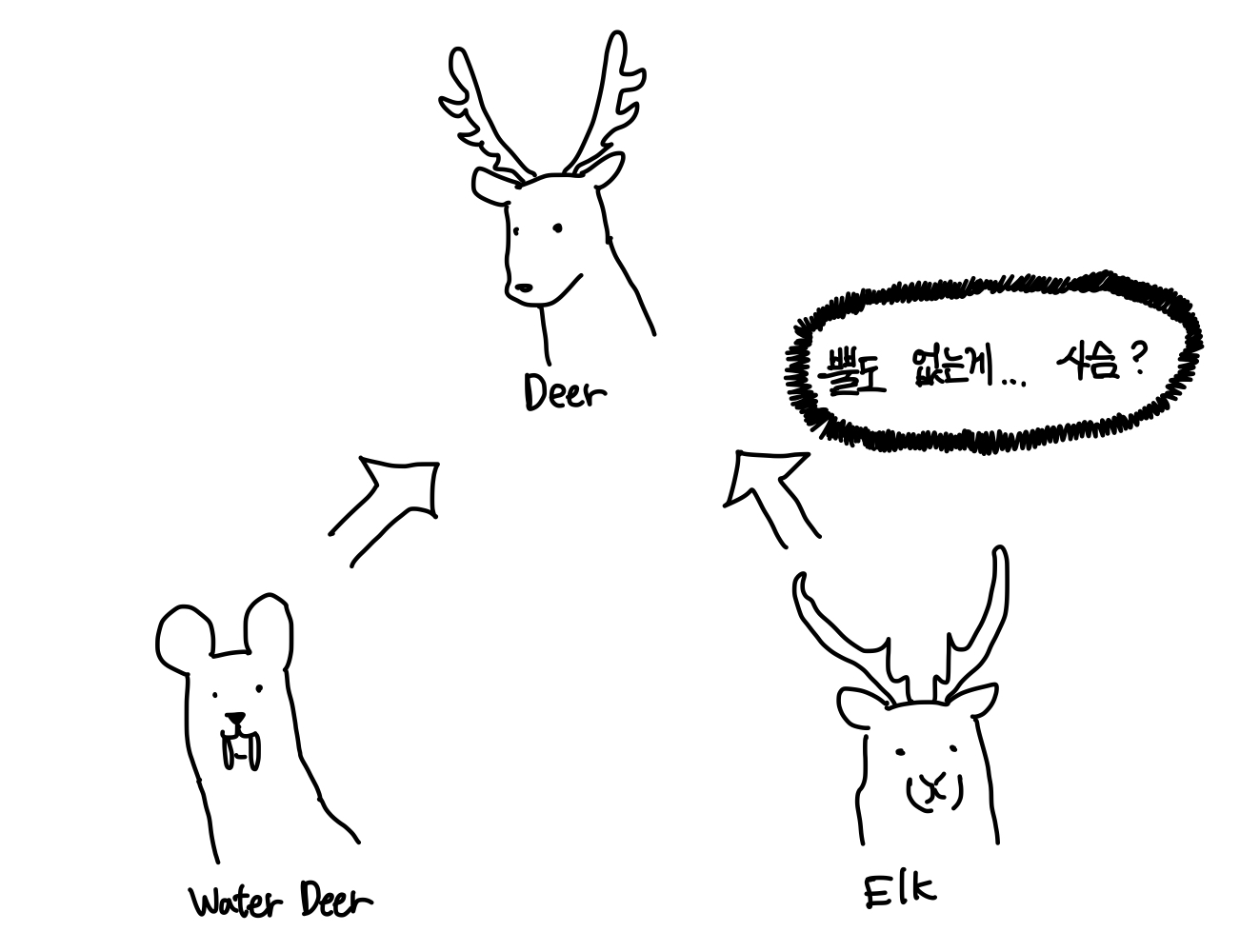 고라니와 순록은 사슴으로서 겹치는 부분이 많기 때문에 사슴을 상속받는 방식으로 재구성했다. ▼