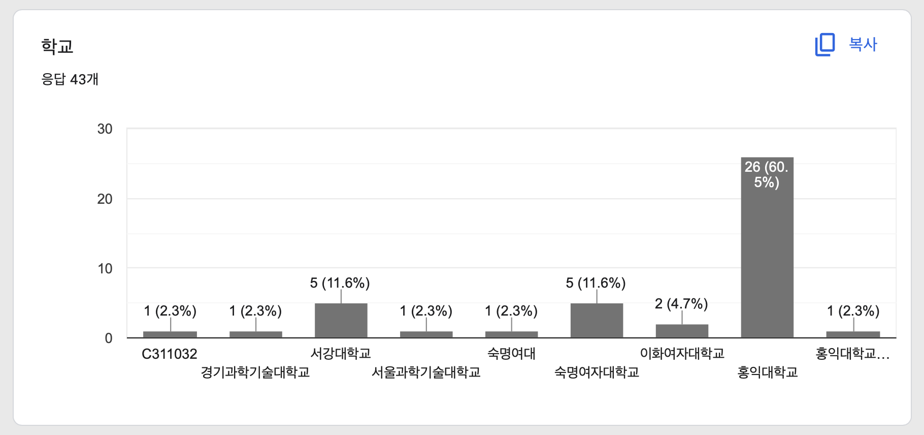 그래서 현재는 홍익대학교 모집 폼은 닫고, 타 학교 모집만 일주일 더 연장할 생각입니다. 어느정도 공통점을 공유하는 사람이 많아야 집단에 스며들기 쉬운데, 너무 타학교 학생이 많게 되면 접점이나 유대를 형성하기 어렵기에 이런 선택을 하게 되었습니다.