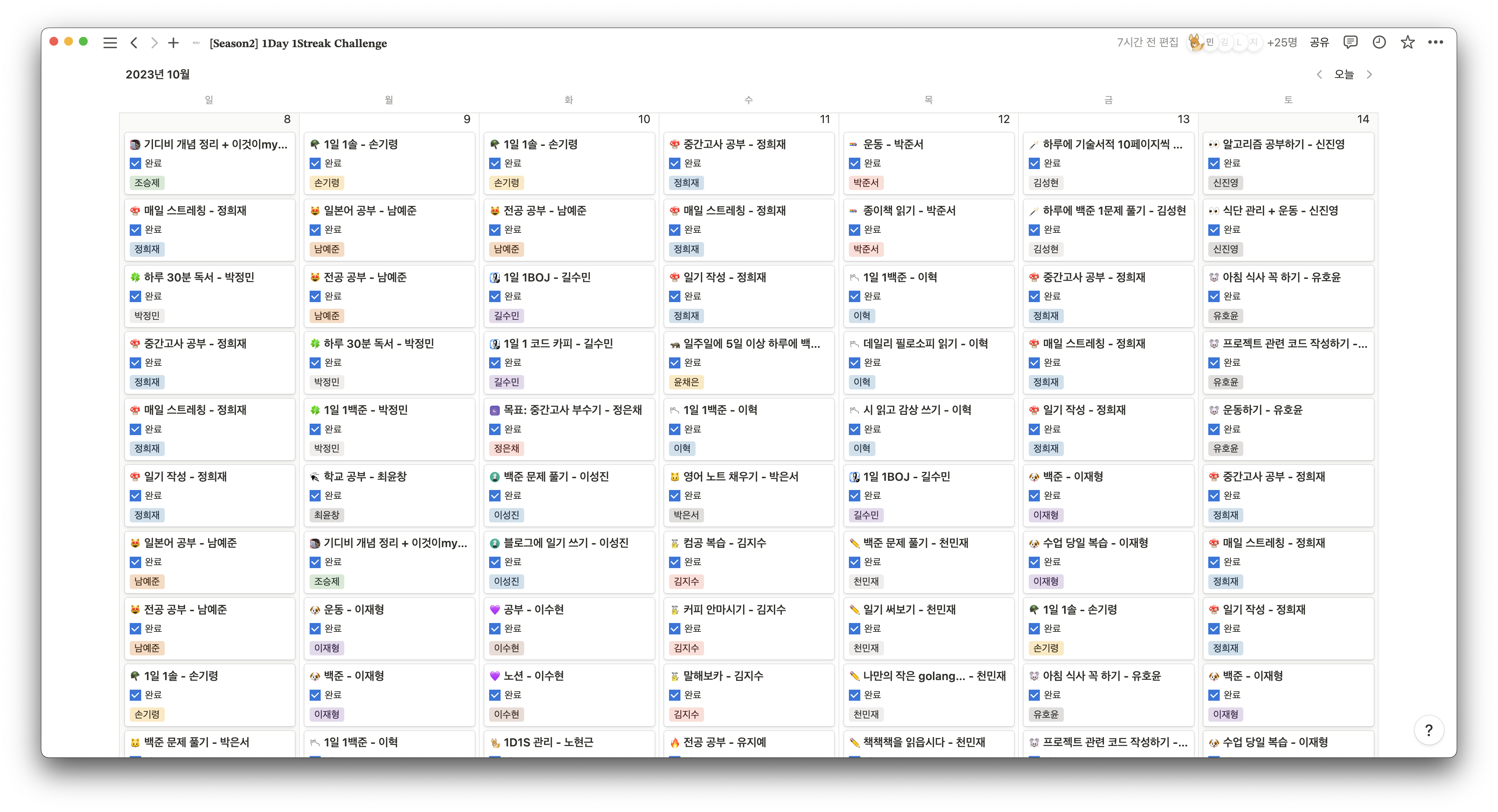 1D1S 시즌2는 9/27부터 모집을 받기 시작하여, 챌린지 시작 2주까지 총 43명의 인원이 모였습니다. 시즌1 때 인원이 19명이었던걸 생각하면, 인원이 2배 보다도 더 많이 모이게 되었습니다.