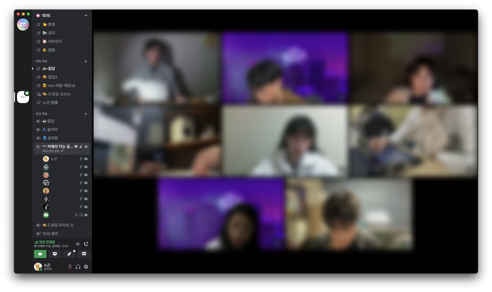 그 이후에는 종종 모여서 책상 캠이나 얼공 캠이나, 캠이 없으면 화면 공유라도 해서 모두가 무언가를 켜놓은 방이 완성이 되었습니다. 모두가 같은 장소에 있지는 않지만, 화상통화를 통해 같이 공부하는 느낌을 받아 결속감을 느낄 수 있었습니다.