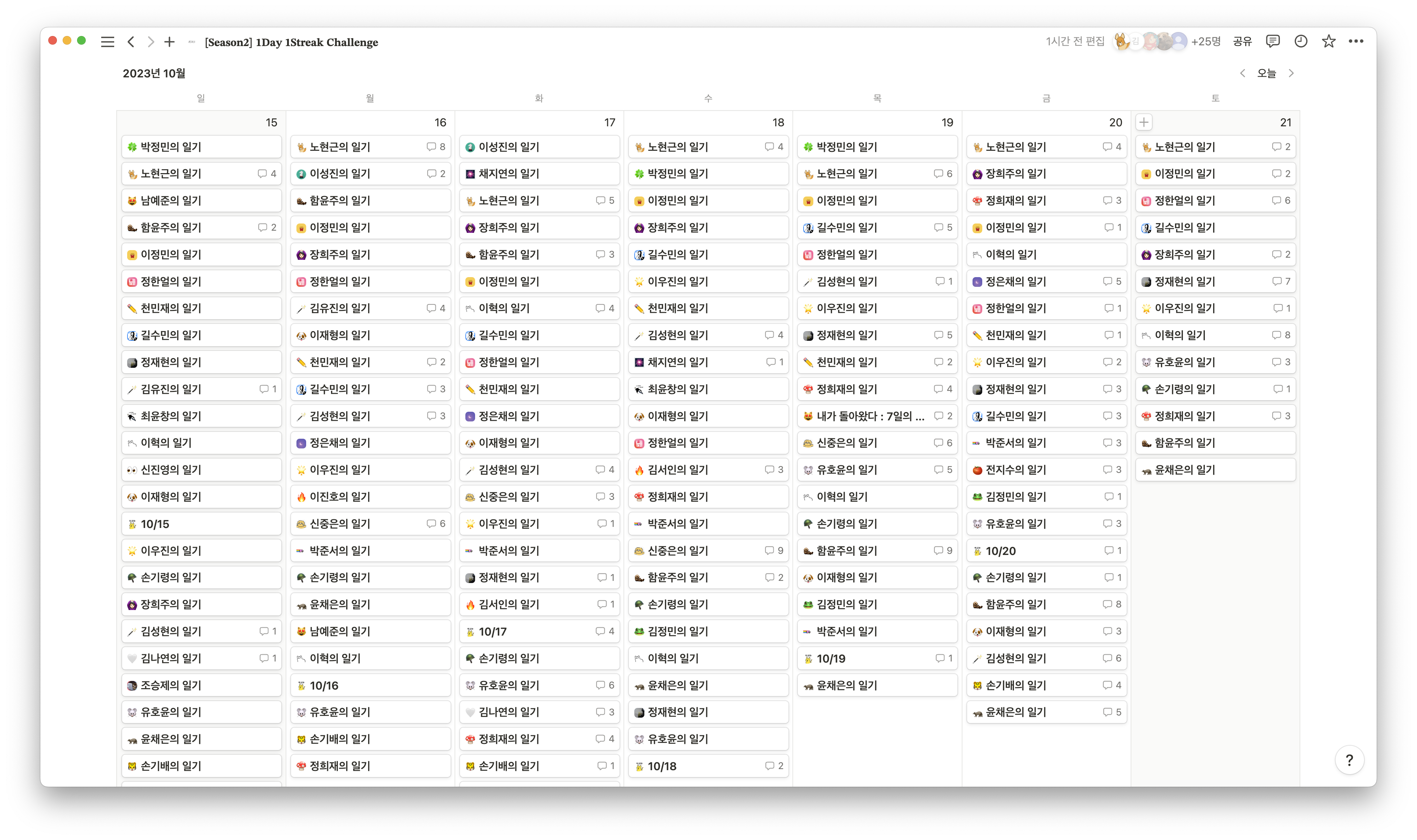 1D1S가 시작된 지 벌써 한 달이 지났습니다. 26일에 들어온 새로운 멤버까지 총 45명이 1D1S 챌린지를 진행중이며, 다들 열심히 일기를 작성해주시고 계십니다. 10월 1일이 엊그제 같은데 벌써 이렇게 많은 일기가 쌓였다는게 조금은 신기합니다. ▼