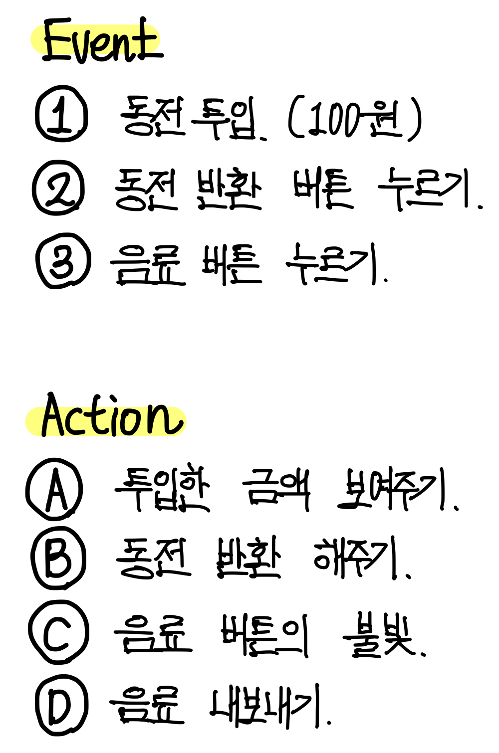 위의 명세를 모두 파악했다면, 명세를 토대로 모든 Event와 Action을 정리한다. ▼