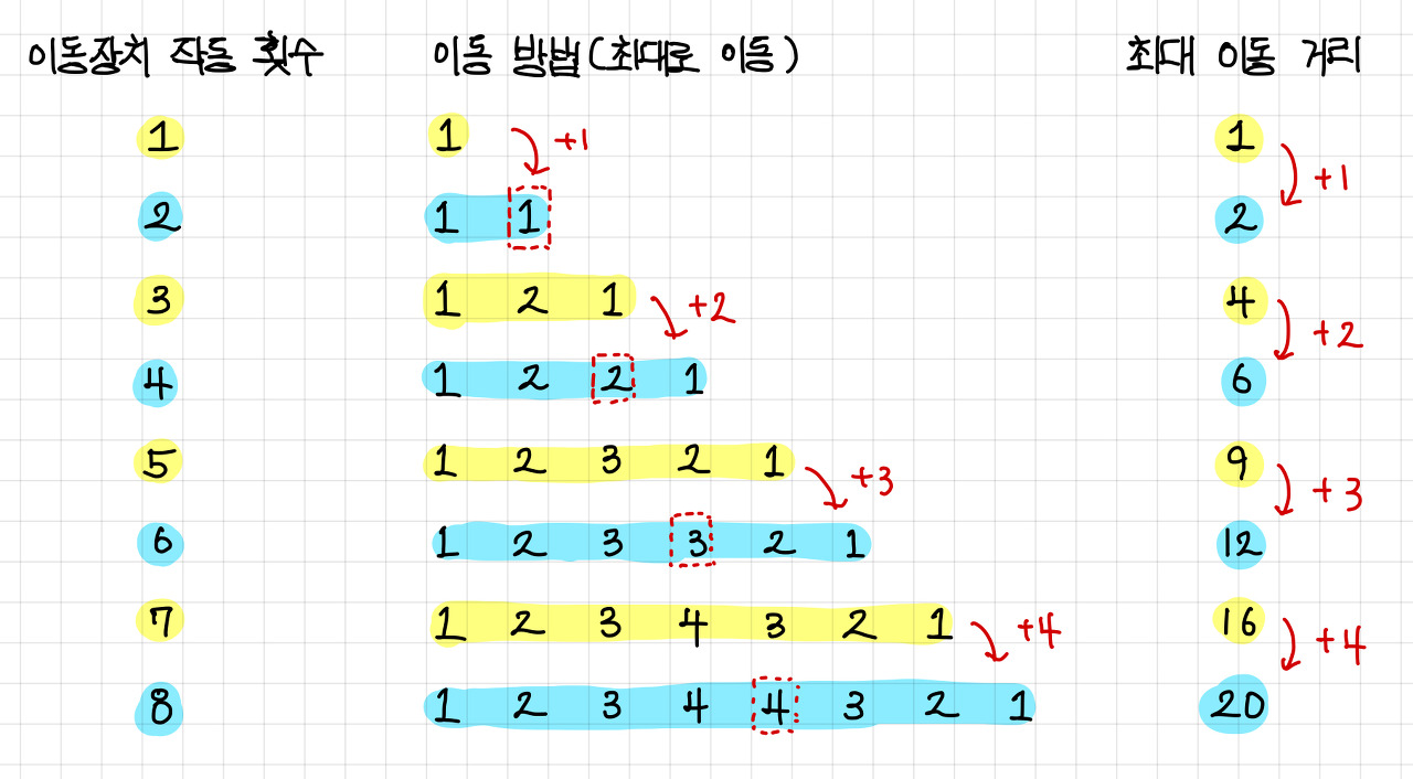 이를 통해 작동 횟수에 따른 최대 이동 거리의 점화식을 얻을 수 있다.
