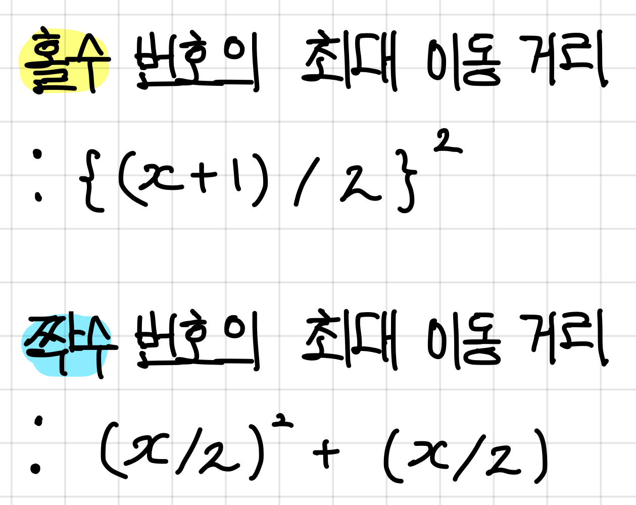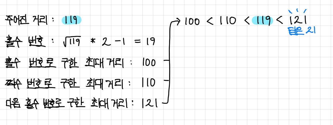 홀수 번호 이동 거리 <= 주어진 거리 < 다음 홀수 번호 이동 거리
