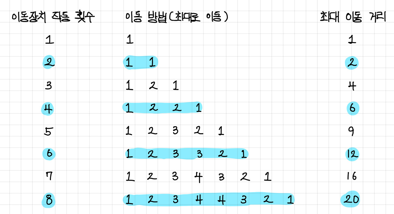 이를 통해 작동 횟수에 따른 최대 이동 거리의 점화식을 얻을 수 있다.